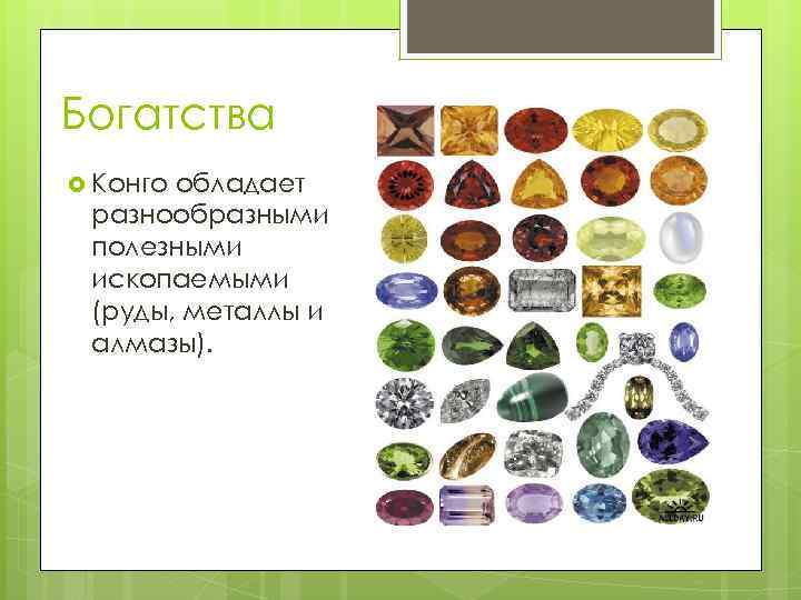 Богатства Конго обладает разнообразными полезными ископаемыми (руды, металлы и алмазы).