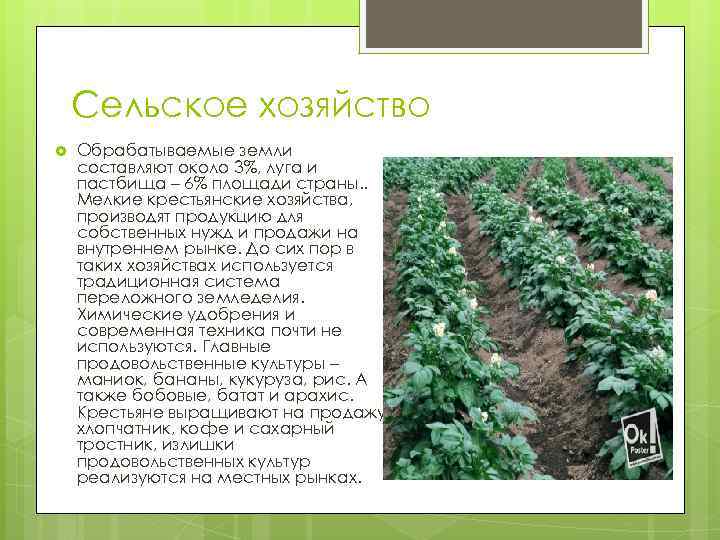 Сельское хозяйство Обрабатываемые земли составляют около 3%, луга и пастбища – 6% площади страны. . Мелкие крестьянские хозяйства, производят продукцию для собственных нужд и продажи на внутреннем рынке. До сих пор в таких хозяйствах используется традиционная система переложного земледелия. Химические удобрения и современная техника почти не используются. Главные продовольственные культуры – маниок, бананы, кукуруза, рис. А также бобовые, батат и арахис. Крестьяне выращивают на продажу хлопчатник, кофе и сахарный тростник, излишки продовольственных культур реализуются на местных рынках.