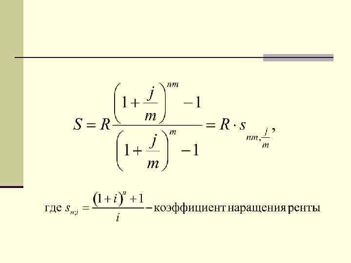 n На последний платеж, произведенный в конце последнего n-го года, проценты не начисляются n Тогда для всей наращенной суммы ренты S получим: