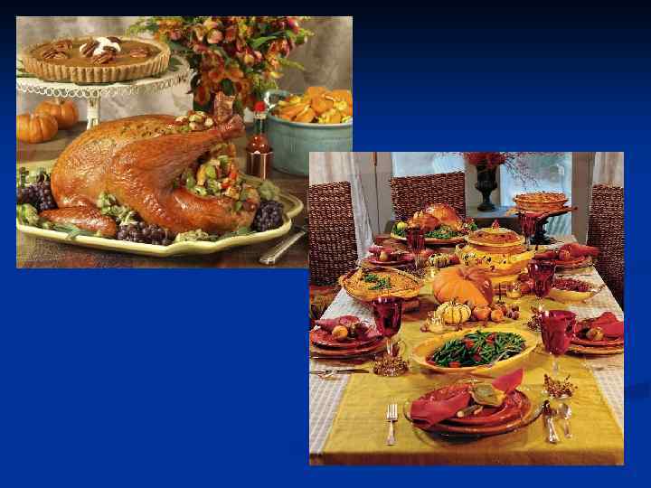Традиции празднования. n Многие блюда стали не только традицией, но и своего рода символами праздника: фаршированная индейка с клюквенным сиропом и большой сладкий тыквенный пирог. Яркие молодые большой тыквы, початки «индейской» кукурузы, яблоки, апельсины, каштаны, орехи, сухие листья и гроздья винограда, свисающие с блюда словно из рога изобилия, не только служат традиционным украшением стола, но и олицетворяют обилие осенних даров природы. Букеты золотых, оранжевых и красно-коричневых хризантем, дополненные веточками с ягодами, довершают ощущение изобилия и щедрости природы, настоящего праздника богатого урожая.