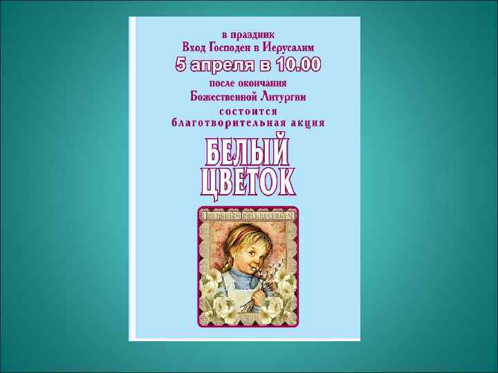 ДЕНЬ МИЛОСЕРДИЯ И БЛАГОТВОРИТЕЛЬНОСТИ ВОСКРЕСНАЯ ШКОЛА ПРИХОДА СВЯТОКАЗАНСКОГО ХРАМА г. ТУЛЫ С 2012 г. ПРОВОДИТ БЛАГОТВОРИТЕЛЬНУЮ АКЦИЮ «БЕЛЫЙ ЦВЕТОК» С 2013 г. в СОРАБОТНИЧЕСТВЕ С МБОУСОШ № 62 С 2014 г. : МБДОУ № 99, № 142 МОУДОД «Детская школа искусств» № 6 г. Тулы, МБОУСОШ № 63, № 62 «Тульским колледжем профессиональных технологий и сервиса» , «Тульским государственным технологическим колледжем» .