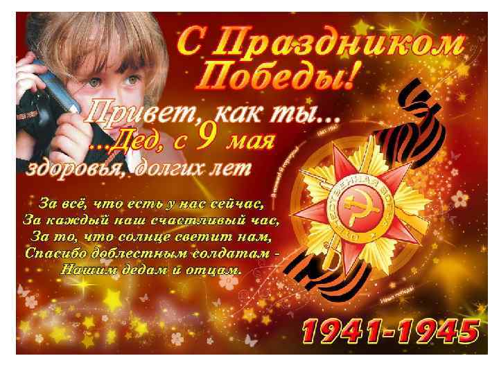 Салют взрывает тишину Палитрой красок в небе синем. Давно прошедшую войну, Не забывает вся Россия. Мы знаем, что родная Русь Своих героев не забудет. Во славу им сегодня пусть Грохочут тысячи орудий!