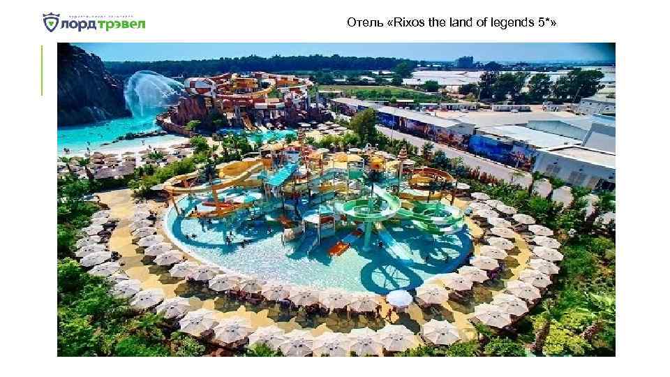 Отель «Rixos the land of legends 5*» • • • Ежедневные шоу-программы Днем. Шоу морских животных: дельфины, Моржи, пингвины, тигр в бассейне Вечером. Тематические шоу Парк развлечений Площадь парка 150 000 м. кв 41 горка, 21 для детей Симулятор рафтинга, серфинг 5 D кинотеатр Бассейн с вулканом и волнами до 2 м. Подводная прогулка в скафандре