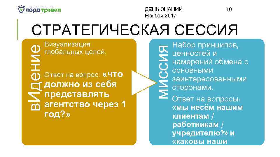 ДЕНЬ ЗНАНИЙ Ноября 2017 18 Визуализация глобальных целей. Ответ на вопрос: «что должно из себя представлять агентство через 1 год? » миссия в. Идение СТРАТЕГИЧЕСКАЯ СЕССИЯ Набор принципов, ценностей и намерений обмена с основными заинтересованными сторонами. Ответ на вопросы: «мы несём нашим клиентам / работникам / учредителю? » и «каковы наши принципы и