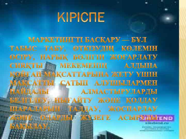 МАЗМҰНЫ І. Кіріспе І Тарау Спорт саласында мүмкіндіктері маркетингті қолданудың ІІ Тарау Спорт маркетингі – маркетингтің жаңа бағыты ретінде ІІІ Тарау Спорттық маркетингті « 4 Р» элементтерінің көмегімен маркетингтік зерттеу Қорытынды ІҮ Қазақстан Республикасында спорттық маркетингті қалыптастыру және оның жағдайы