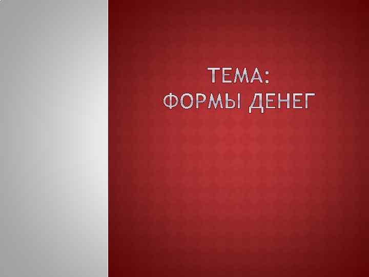 Формы денег Полноценные товародень ги полноценн ые монеты Неполноценные неполноцен ные монеты бумажные и кредитные деньги