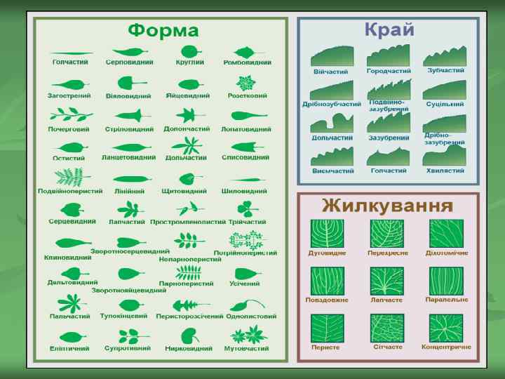 Характер почленування листкової пластинки лопатеві - пластинка ціла або розділена не глибше ¼ ширини роздільні – виїмки сягають глибше 1/4 але не більше 2/3 ширини листкової пластинки розсічені – сильно розчленовані листки, розсіченість яких сягає центральної жилки