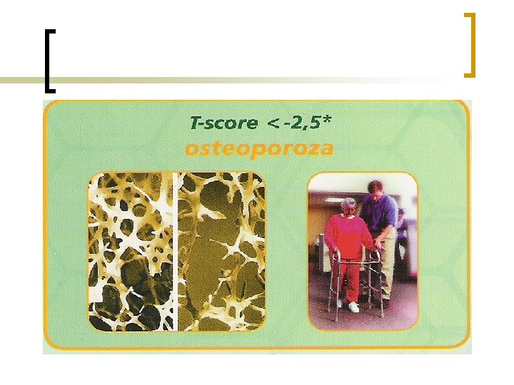 Osteoporoza n Przewlekłe, postępujące schorzenie wyróżniające się niską masą kostną i degradacją mikroarchitektury tkanki kostnej. Prowadzi to do osłabienia wytrzymałości kości i w konsekwencji do wzrostu ryzyka złamań; gęstość mierzona metodą DEXA kości poniżej 2, 5 lub więcej odchyleń standardowych poniżej średniej dla młodych i zdrowych ludzi n (T-score równy lub niższy -2, 5). Wyróżniamy osteoporozy pierwotne i wtórne.