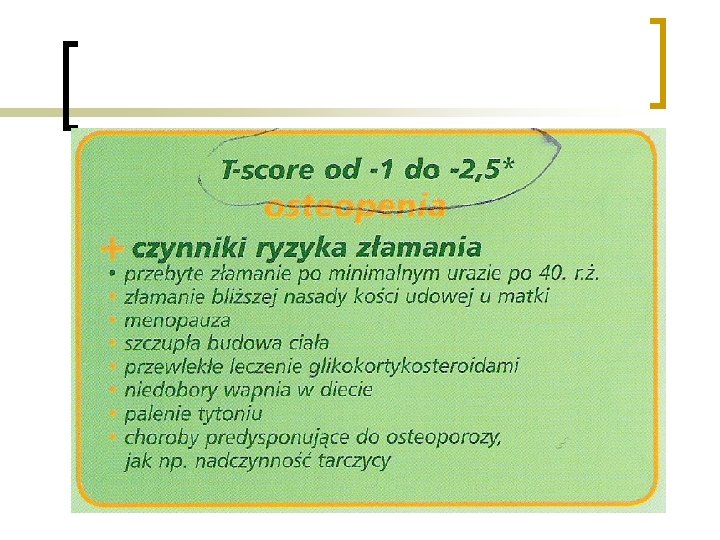 czynniki ryzyka złamania kości – wskazania do densytometrii Występujące samodzielnie: n wiek - dla kobiet 65 lat i dla mężczyzn 70 lat n przebyte złamanie osteoporotyczne kręgosłupa i b. k. k. u. niezależnie od wieku n przebyte złamanie osteoporotyczne o innej lokalizacji niezależnie od wieku n przebyte złamanie osteoporotyczne b. k. k. u. u rodziców, po 50. r. ż. u ojca i po menopauzie u matki n przewlekłe przyjmowanie kortykosteroidów w dziennej dawce < 7, 5 mg w przeliczeniu na prednizon, przez co najmniej 3 miesiące n skłonność do upadków: co najmniej 2 upadki z powodów medycznych (np. zaburzenia widzenia, zaburzenia neurologiczne) n aktualnie trwająca pierwotna nadczynność przytarczyc