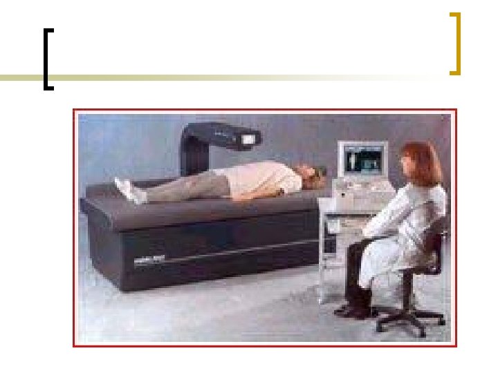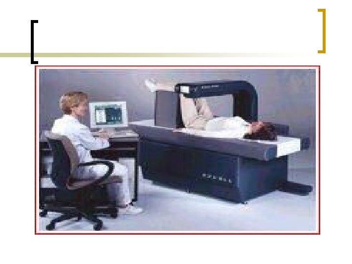 DEXA (Dual Energy X - ray Absorptimetry) n Absorpcjometria podwójnej energii promieniowania rentgenowskiego. Metoda densytometryczna stosowana do oceny gęstości minerału kostnego w kręgosłupie, bliższej części kości udowej, dalszej części kości przedramienia lub całego szkieletu. n Nie pozwala na rozróżnienie struktury korowej i beleczkowej. Metoda referencyjna dla innych metod densytometrycznych.