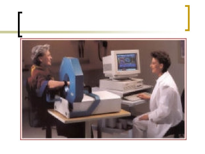 n n n CHARAKTERYSTYKA: Wymiar 182 cm x 122 cm Gabaryty stołu 181 cm x 88 cm Skrócony czas badania dla kręgosłupa AP <1, 5 min a dla kości udowej <2 min Dawka: <1, 0 m. Rem Wysoka precyzja - -1 % kręgosłup; 1, 2 % - dla kości udowej Oryginalny system 77 punktowej kalibracji dynamiczna filtracja baza referencyjna T-score i Z-score baza referencyjna dla dzieci od lat 2 -20 Przyjazne oprogramowanie sterujące pracą aparatu wyposażono dodatkowo w opcję umożliwiającą ocenę ryzyka złamań (FRACTURE RISK ASSESMENT)