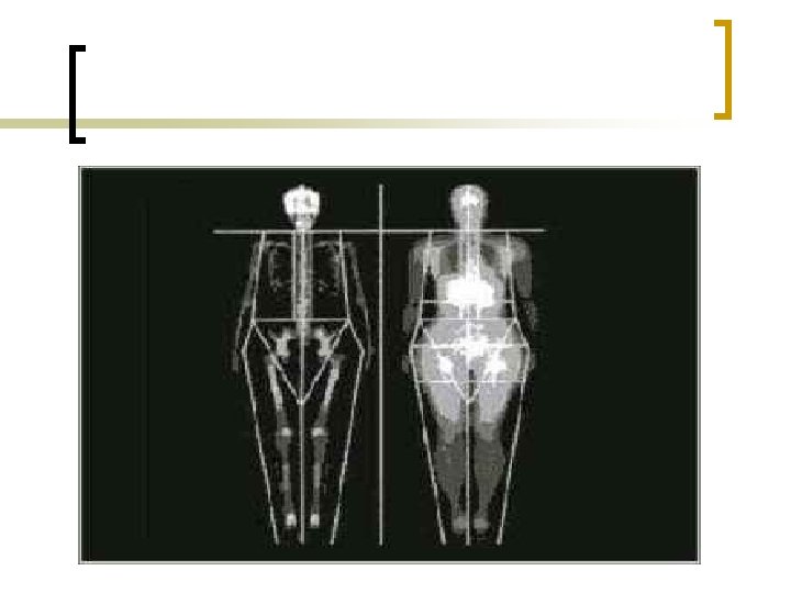 Total Body n W opcji Total Body ocenie względem wartości szczytowych dla płci lub równowiekowej grupy kontrolnej poddana zostaje masa tkanki kostnej całego szkieletu poprzez wyznaczenie gęstości w g/cm 2. n Wynik pomiaru całego szkieletu wyrażany jest zarówno w wartościach T- score jak i Z- score. Możliwa jest również ocena mineralizacji tkanki kostnej w poszczególnych segmentach szkieletu. n W opcji Total Body analizie poddany jest również skład ciała z wyznaczeniem masy tkanki tłuszczowej (Fat mass) oraz jej procentowego udziału względem masy ciała (% Fat) a także rozkładu percentylowego względem populacji referencyjnej. W opcji Total Body możliwa jest również ocena masy surogatu tkanki mięśniowej poprzez wyznaczenie Lean Body Mass.