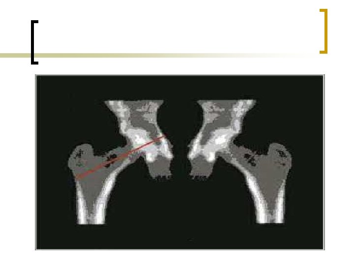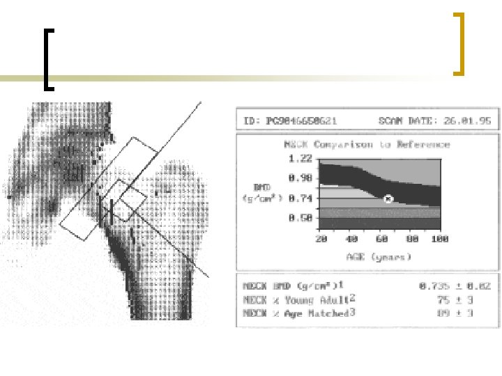 n n Przypadek ten ilustruje jak cennym badaniem w diagnostyce osteoporozy jest densytometria i jak niska gęstość kości utrudnia, a często uniemożliwia leczenie powikłań osteoporozy czyli złamań. Chora lat 89 po epizodzie złamań kompresyjnych kręgosłupa (Th 7 -Thll, L 2, L 4) przed dwoma laty i złamaniem nasady dalszej kości promieniowej prawej przed sześciu laty, do tej pory nie leczona z powodu osteoporozy miała wykonane badanie densytometryczne kręgosłupa L 2 -L 4 i szyjek kości udowej (metodą DEXA). Badanie wykazało bardzo niskie wartości gęstości mineralnej kręgosłupa (T-score = -4. 28) i alarmująco niskie wartości gęstości mineralnej kości udowych (T score szyjki lewej = 7. 52), T-score szyjki prawej = -7. 31). Wartości te wskazują na bardzo nasiloną osteoporozę i ryzyko złamań w takim przypadku jest wysokie.