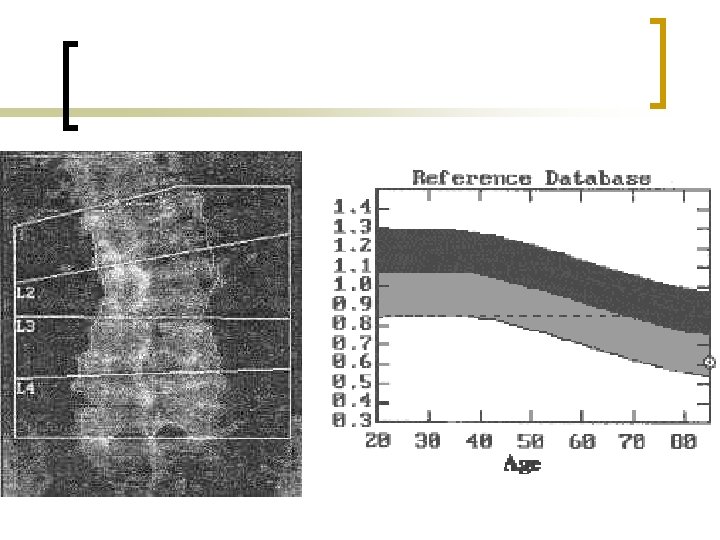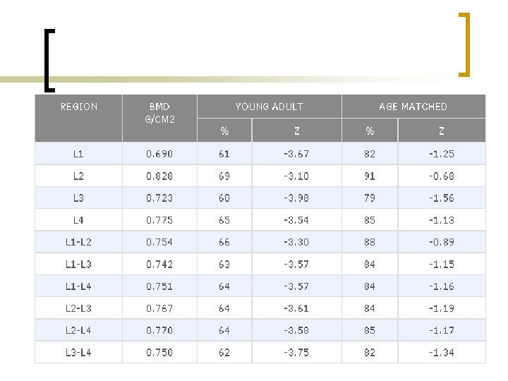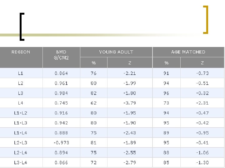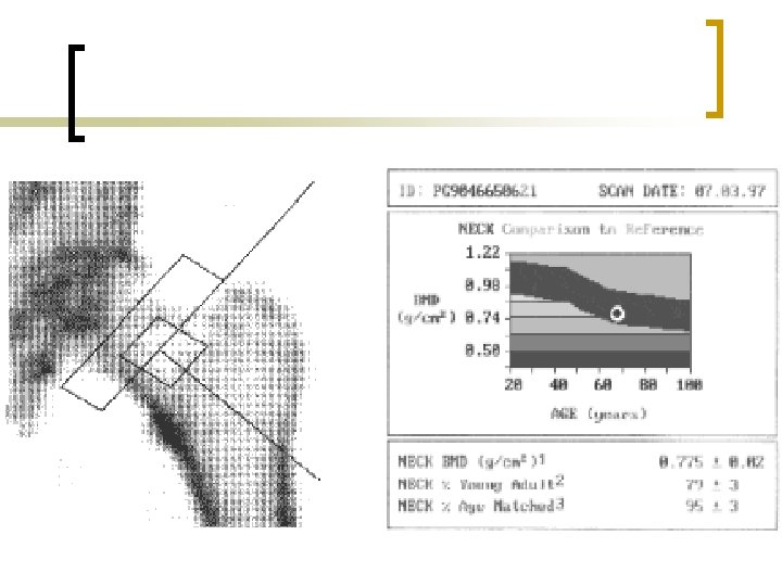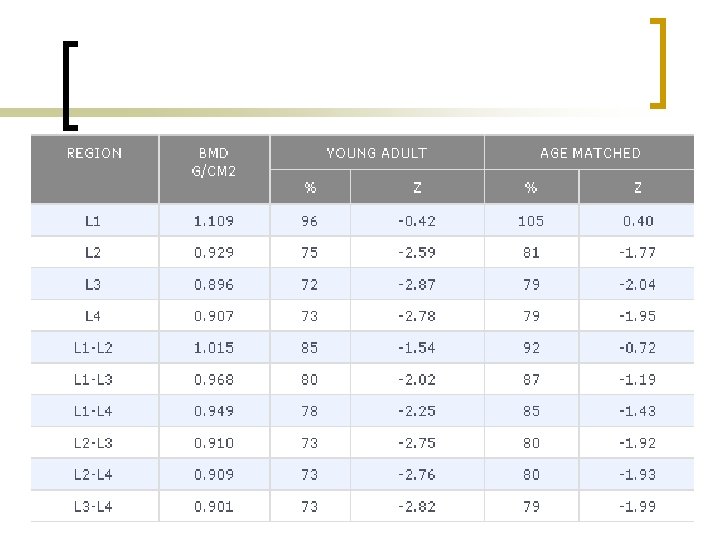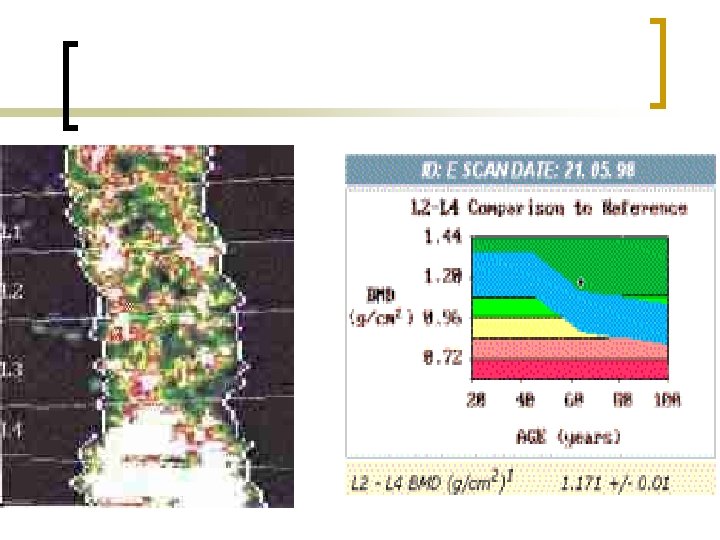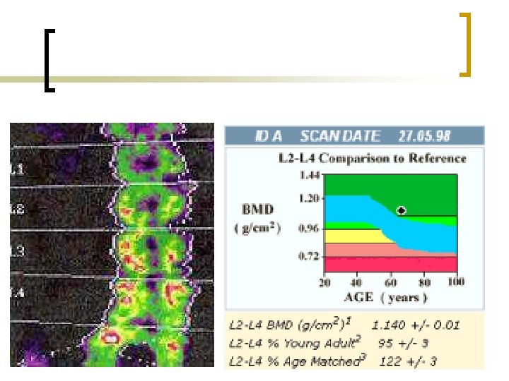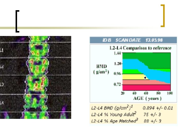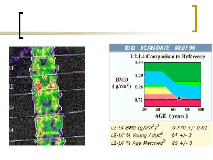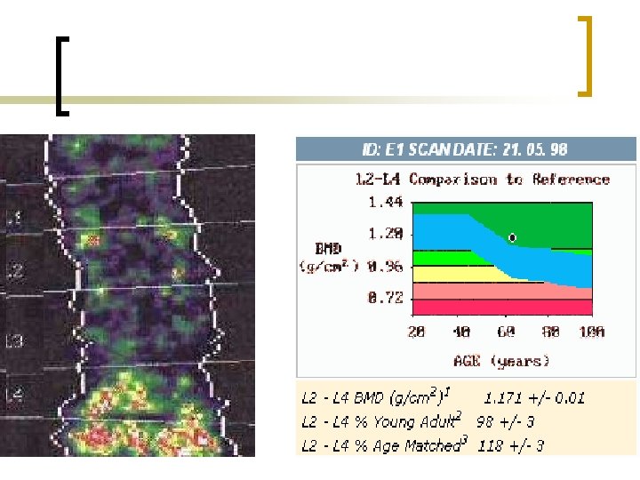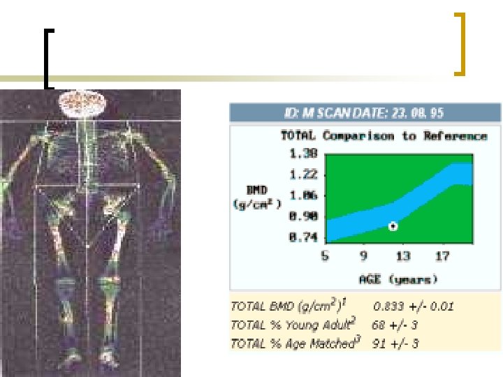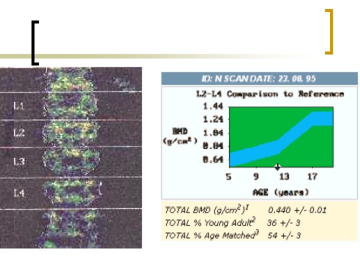 n n Badania densytometryczne są szeroko stosowane u pacjentów zagrożonych osteoporozą posterydową, także u dzieci. Oto przykład wyniku badania densytometrycznego całego układu kostnego (TOTAL BODY) i odcinka lędźwiowego kręgosłupa (AP SPINE) wykonanego w programie pediatrycznym u 12 - letniego chłopca po sterydoterapii. Wartość BMD całego kośca niewiele odbiega od normy wiekowej. Natomiast wartości BMD odcinka lędźwiowego kręgosłupa jest znacznie obniżona w porównaniu do normy wiekowej.