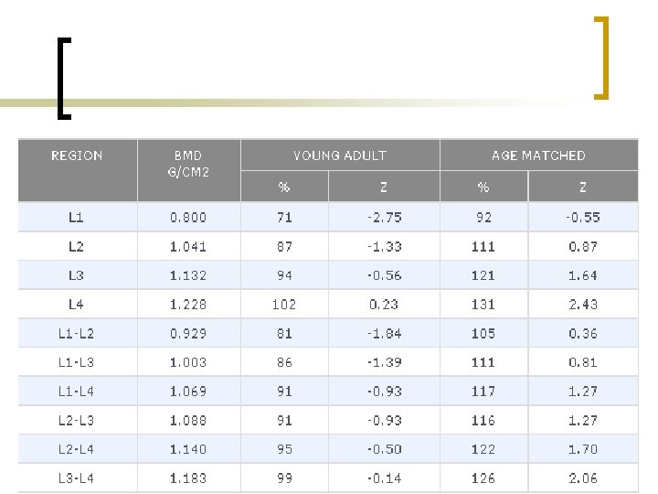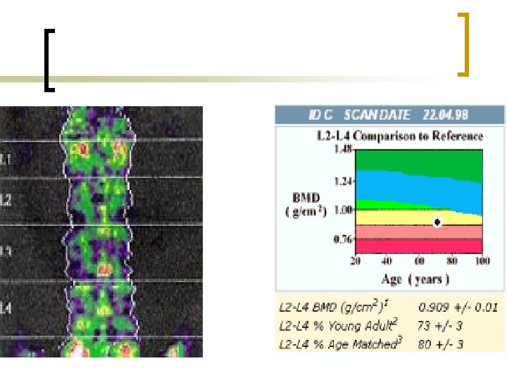 Wyniki badań densytometrycznych BADANIA KRĘGOSŁUPA n n n Osteoporozę określa się jako chorobę uogólnioną. Niekiedy jednak dochodzi do znacznego odwapnienia tylko jednego z kręgów. Najczęściej krąg L 1, ale zdarza się też inaczej (np. L 4). W takich przypadkach interpretacja wyniku gęstości kości w odcinku L 2 - L 4, uważanego za standard, przedstawia pewne trudności. Taka sytuacja wymaga analizy wartości BMD dla poszczególnych kręgów.