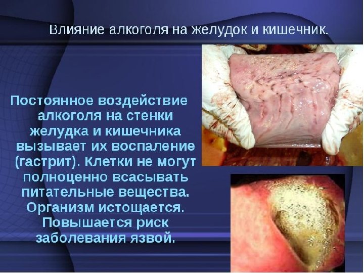 Желудок, поджелудочная железа При попадании алкоголя в организм первыми страдают пищевод и желудок И чем крепче алкогольные изделия, тем тяжелее повреждения. Алкоголь подавляет выделение пищеварительных ферментов поджелудочной железы, что препятствует расщеплению питательных веществ на молекулы, пригодные для питания клеток организма. Повреждая клетки внутренней поверхности желудка и поджелудочной железы, алкоголь (особенно при употреблении крепких алкогольных изделий) угнетает процесс всасывания питательных веществ, а перенос некоторых из них в кровь делает вообще невозможным. Например, вследствие недостаточности в организме соли фолиевой кислоты изменяются клетки, устилающие тонкую кишку, которые должны обеспечивать всасывание в кровь глюкозы, натрия, а также самой соли фолиевой кислоты и других питательных веществ. При регулярном приёме даже небольших доз алкоголя железы, расположенные в стенке желудка и вырабатывающие желудочный сок, под влиянием алкогольного раздражения сначала выделяют много слизи, а затем атрофируются. Пищеварение в желудке становится неполноценным, пища застаивается или, не переваренная, поступает в кишечник. Возникает гастрит, который, если не устранить его причину и серьёзно не лечить, может перейти в рак желудка.