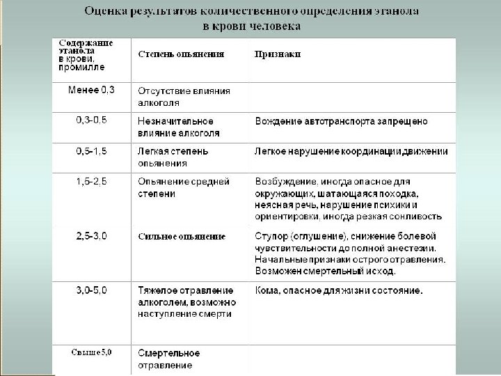 Любая доза алкоголя, даже не вызывающая опьянения (начиная с концентрации 1 -10 мкг на мл крови), причиняет вред человеческому организму. В действии этанола на организм выделяют две фазы: q резорбции (всасывания) q элиминации (выведения). Время от приёма спиртных «напитков» до момента достижения максимальной концентрации в крови составляет период резорбции. Скорость всасывания этанола в период резорбции неодинакова. Так, пока этанол находится в желудке, резорбция довольно медленная, затем, по мере его поступления в тонкую кишку скорость всасывания нарастает, а в самом конце фазы резорбции всасывание опять замедляется. Считается, что в зависимости от индивидуальных особенностей организма период всасывания может увеличиться почти в 2, 5 раза (до 2– 6 часов), но для каждого конкретного человека это время достаточно постоянно. В фазе резорбции насыщение этанолом органов и тканей происходит быстрее, чем его окисление и выведение, именно поэтому наблюдается повышение его концентрации в крови. Этанол распределяется в организме человека, по данным большинства исследователей, в 64% массы тела, то есть практически во всём водном пространстве организма.