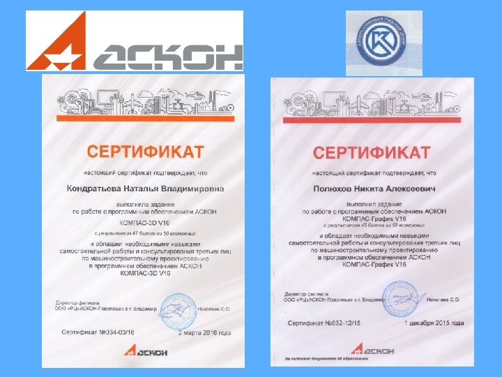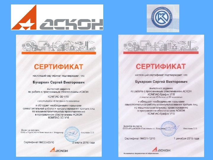 Преподаватели колледжа прошли сертификацию по программному обеспечению АСКОН: 1. Букаркин Сергей Викторович - КОМПАС 3 D V 16 КОМПАСГрафик. Сертификаты: V 16033 -03/16 от 02. 03. 2016031 -12/15 от 01. 12. 2015. 2. Кондратьева Наталья Владимировна - КОМПАС 3 D. Сертификат V 16034 -03/16 от 02. 03. 2016. 3. Полюхов Никита Алексеевич - КОМПАС-График. Сертификат V 16032 -12/15 от 01. 12. 2015.
