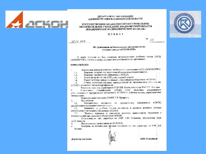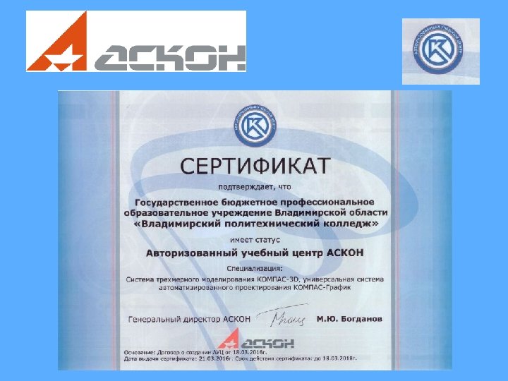 31 марта 2016 г. в торжественной обстановке представитель центрального офиса ЗАО «АСКОН» (г. Санкт-Петербург) директор Филиала ООО «РЦ «Аскон – Поволжье» в г. Владимир С. О. Николаев вручил директору колледжа Д. Ю. Полянскому сертификат, свидетельствующий об открытии Авторизованного учебного центра «АСКОН-ВПК»