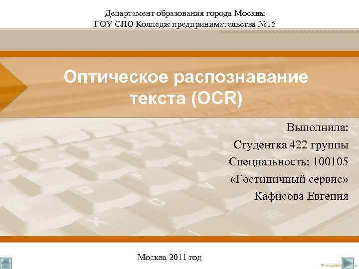 Департамент образования города Москвы ГОУ СПО Колледж предпринимательства № 15 Оптическое распознавание текста (OCR) Выполнила: Студентка 422 группы Специальность: 100105 «Гостиничный сервис» Кафисова Евгения Москва 2011 год