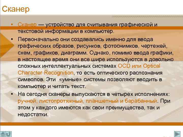Сканер • Сканер — устройство для считывания графической и текстовой информации в компьютер. • Первоначально они создавались именно для ввода графических образов, рисунков, фотоснимков, чертежей, схем, графиков, диаграмм. Однако, помимо ввода графики, в настоящее время они все шире используются в довольно сложных интеллектуальных системах OCD или Optical Character Recognition, то есть оптического распознания символов. Эти «умные» системы позволяют вводить в компьютер и читать текст. • На сегодня сканеры выпускаются в четырех исполнениях: ручной, листопротяжный, планшетный и барабанный. При этом у каждого имеются как свои преимущества, так и недостатки.