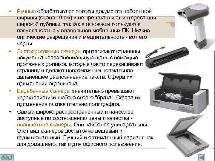 • • Ручные обрабатывают полосы документа небольшой ширины (около 10 см) и не представляют интереса для широкой публики, так как в основном пользуются популярностью у владельцев мобильных ПК. Низкие оптические разрешения и медлительность - вот его черты. Листопротяжные сканеры протягивают страницы документа через специальную щель с помощью протяжных роликов, которые часто перекашивают страницу и делают невозможным нормальное дальнейшее распознавание текста. Сфера их применения ограничена. Барабанные сканеры значительно превышают характеристики любого своего "брата". Сфера их применения исключительно полиграфия. Самые широко распространенные и наиболее доступные по соотношению цены и качества планшетные сканеры. Они наиболее универсальны. Этот вид сканеров достаточно дешевый и функциональный. Лучший и оптимальный вариант как для домашнего, так и для офисного пользования.
