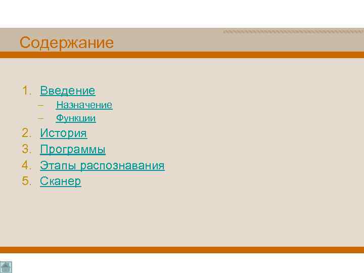 Содержание 1. Введение – – 2. 3. 4. 5. Назначение Функции История Программы Этапы распознавания Сканер