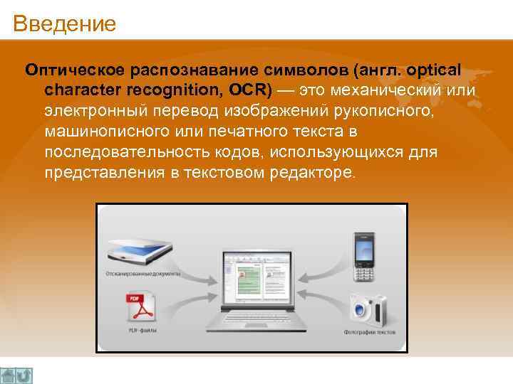 Введение Оптическое распознавание символов (англ. optical character recognition, OCR) — это механический или электронный перевод изображений рукописного, машинописного или печатного текста в последовательность кодов, использующихся для представления в текстовом редакторе.