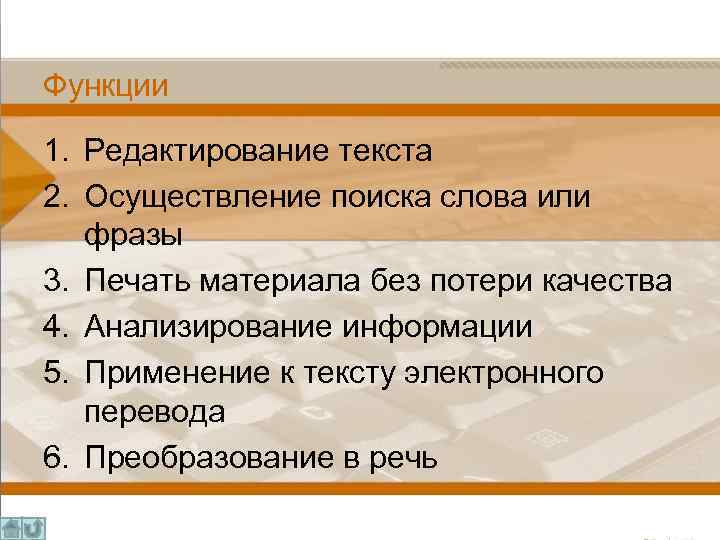 Функции 1. Редактирование текста 2. Осуществление поиска слова или фразы 3. Печать материала без потери качества 4. Анализирование информации 5. Применение к тексту электронного перевода 6. Преобразование в речь
