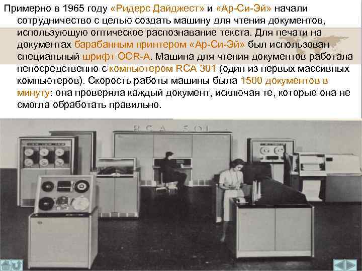 Примерно в 1965 году «Ридерс Дайджест» и «Ар-Си-Эй» начали сотрудничество с целью создать машину для чтения документов, использующую оптическое распознавание текста. Для печати на документах барабанным принтером «Ар-Си-Эй» был использован специальный шрифт OCR-A. Машина для чтения документов работала непосредственно с компьютером RCA 301 (один из первых массивных компьютеров). Скорость работы машины была 1500 документов в минуту: она проверяла каждый документ, исключая те, которые она не смогла обработать правильно.