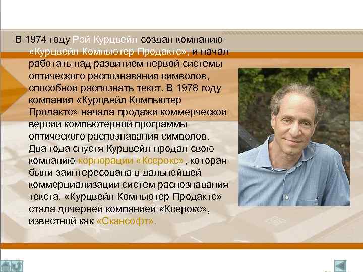 В 1974 году Рэй Курцвейл создал компанию «Курцвейл Компьютер Продактс» , и начал работать над развитием первой системы оптического распознавания символов, способной распознать текст. В 1978 году компания «Курцвейл Компьютер Продактс» начала продажи коммерческой версии компьютерной программы оптического распознавания символов. Два года спустя Курцвейл продал свою компанию корпорации «Ксерокс» , которая были заинтересована в дальнейшей коммерциализации систем распознавания текста. «Курцвейл Компьютер Продактс» стала дочерней компанией «Ксерокс» , известной как «Скансофт» .