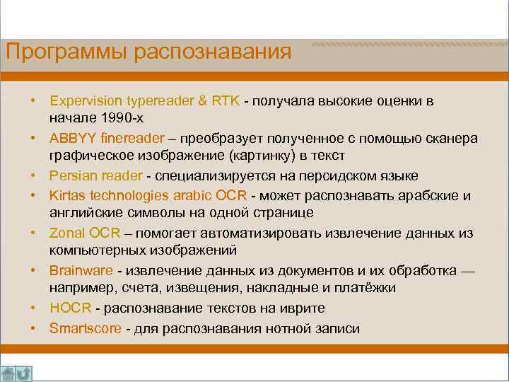 Программы распознавания • Expervision typereader & RTK - получала высокие оценки в начале 1990 -х • ABBYY finereader – преобразует полученное с помощью сканера графическое изображение (картинку) в текст • Persian reader - специализируется на персидском языке • Kirtas technologies arabic OCR - может распознавать арабские и английские символы на одной странице • Zonal OCR – помогает автоматизировать извлечение данных из компьютерных изображений • Brainware - извлечение данных из документов и их обработка — например, счета, извещения, накладные и платёжки • HOCR - распознавание текстов на иврите • Smartscore - для распознавания нотной записи
