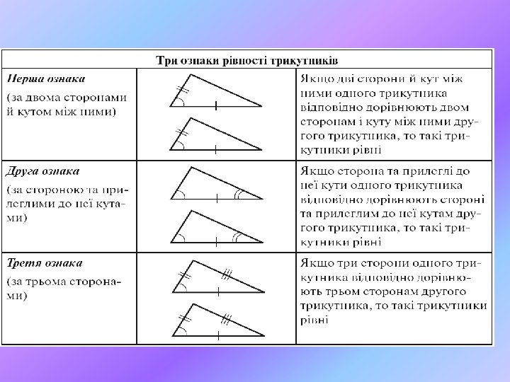 Зміст: 1. Перша ознака рівності трикутників. 2. Друга ознака рівності трикутників. 3. Задачі на застосування першої і другої ознаки. 4. Третя ознака рівності трикутників. 5. Рівнобедрений трикутник.