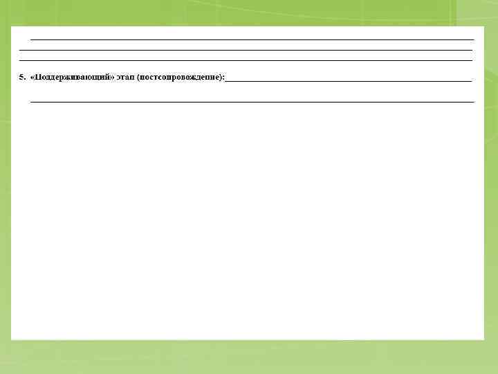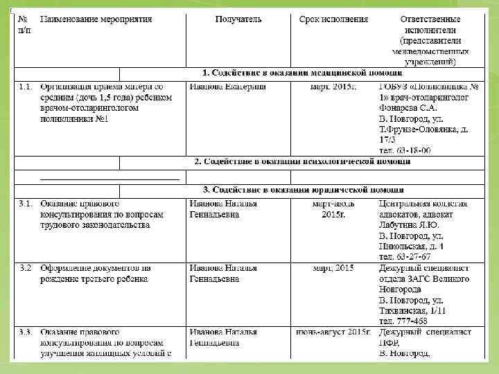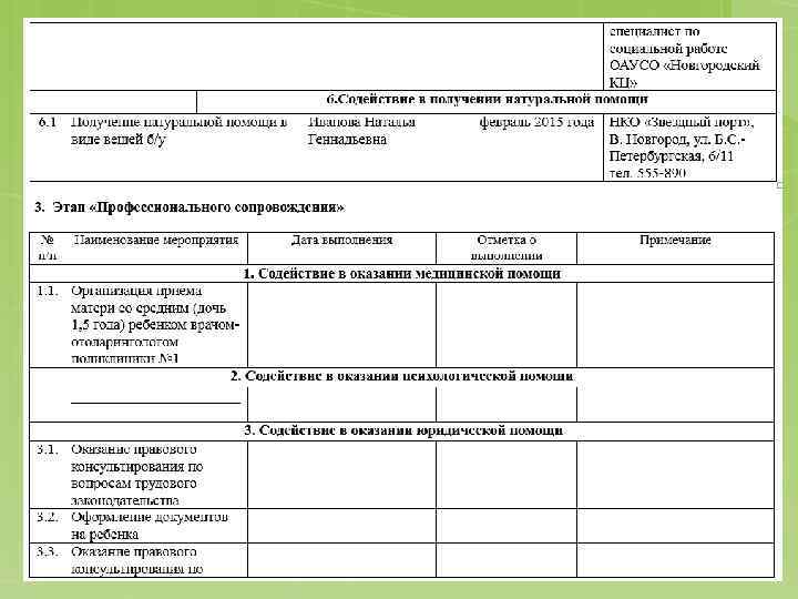 Договорный этап Определены действия куратора и семьи в целях разрешения проблем семьи На заседании участковой социальной комиссии составлен совместный план сопровождения План по социальному сопровождению утвержден на заседании рабочей группы План направлен в заинтересованные организации, ответственные за его реализацию