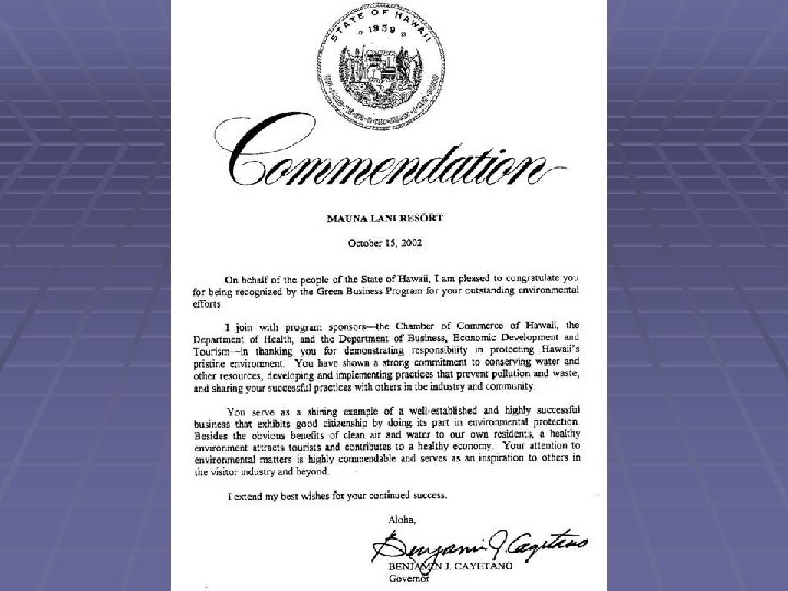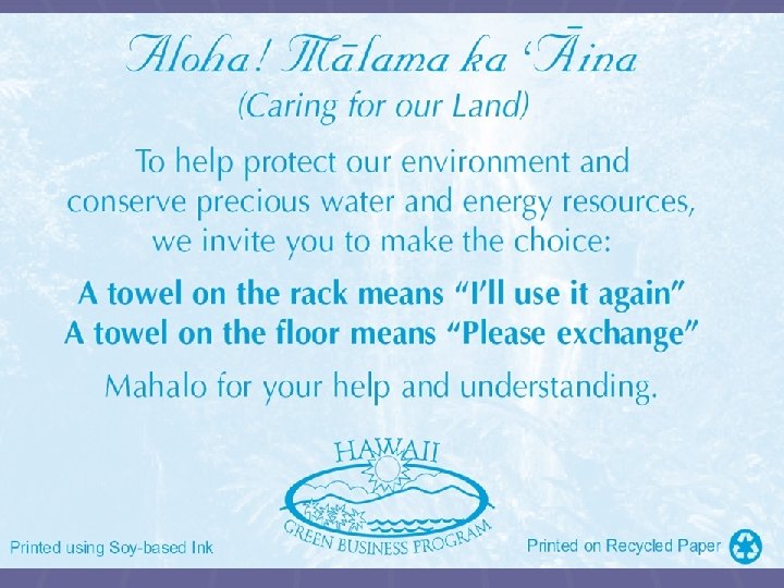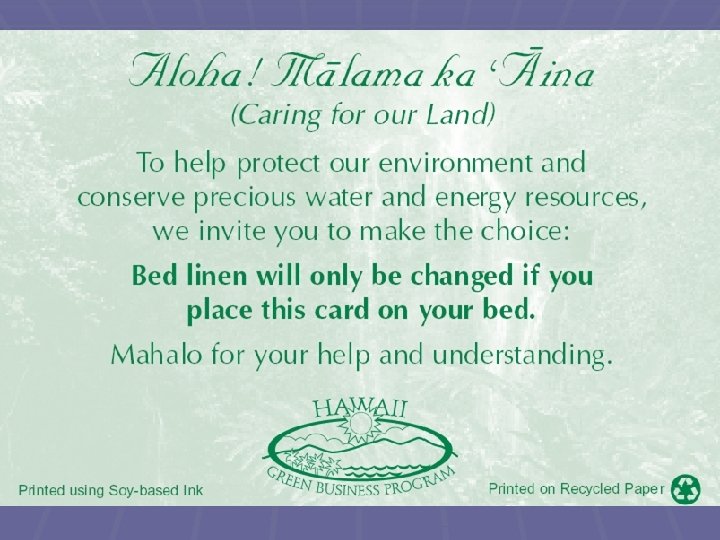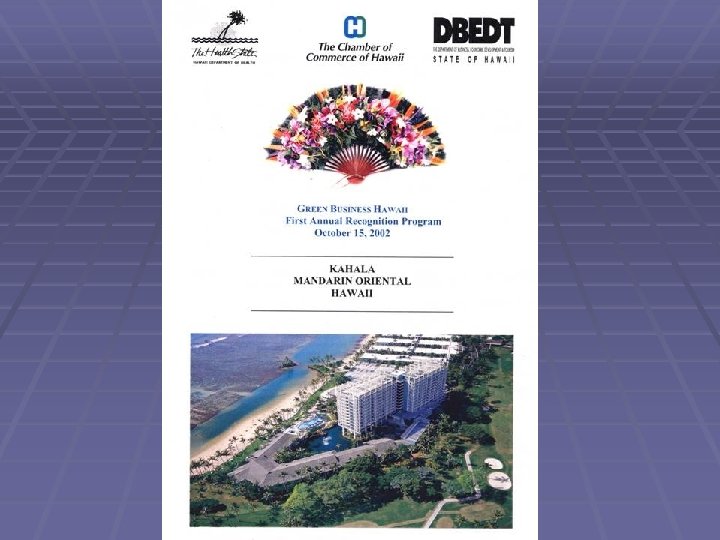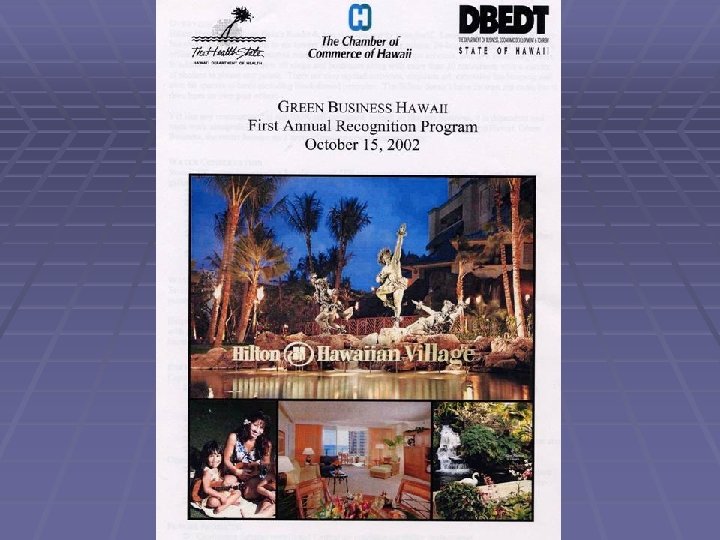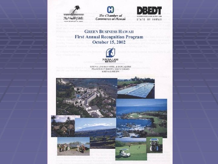 Hawaii Green Business Website http: //www. state. hi. us/dbedt/ert/greenbusiness/index. html § Introduction § Green Hotels List of participants § Checklist § Award Winners § § Water Conservation Measures Tips for Hotel § Site Examples § Water Conservation Card § Drought Conditions §