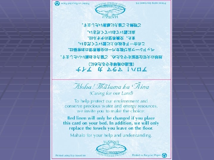Hotel Water Conservation Card Project § Business Organizations § Chamber of Commerce of Hawaii § Hawaii Hotel & Lodging Association § Companies § Hawaiian Electric Company § Hilton Hawaiian Village § Sheraton Hotels & Resorts Hawaii § State Departments § Department of Health § Department of Land & Natural Resources § Department of Business, Economic Development & Tourism § Counties § § Hawaii Department of Water Honolulu Board of Water Supply Kauai Department of Water Maui Department of Water Supply