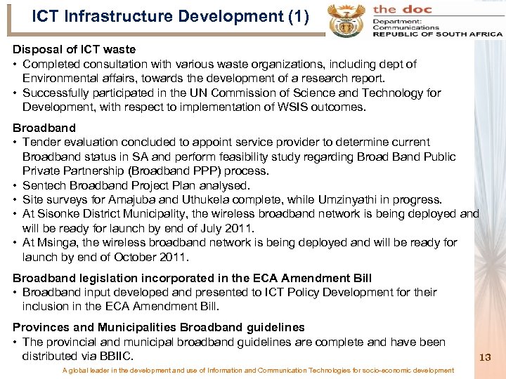 ICT Policy Development (5) Additional achievement • Two Local Government Election Training Workshops for community radio journalists were hosted in Johannesburg and Cape Town. • Pre-inspection for the rollout of broadcasting infrastructure in fifteen (15) community radio stations has been completed. • The Regional Signal Piracy Seminar was hosted and a report was produced. • Forty community radio stations benefited from signal distribution subsidy. • Workshop on the development of an Integrated DTT Rollout plan was hosted and a Plan was developed. 12 A global leader in the development and use of Information and Communication Technologies for socio-economic development