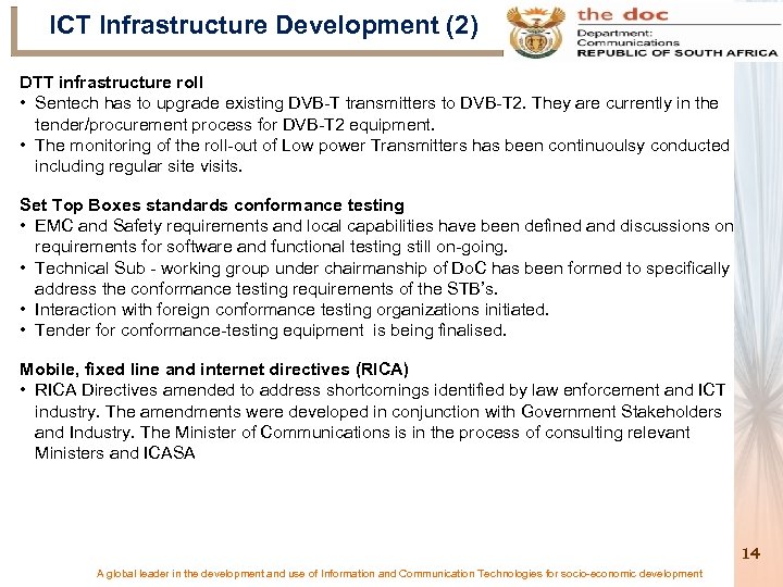 ICT Infrastructure Development (1) Disposal of ICT waste • Completed consultation with various waste organizations, including dept of Environmental affairs, towards the development of a research report. • Successfully participated in the UN Commission of Science and Technology for Development, with respect to implementation of WSIS outcomes. Broadband • Tender evaluation concluded to appoint service provider to determine current Broadband status in SA and perform feasibility study regarding Broad Band Public Private Partnership (Broadband PPP) process. • Sentech Broadband Project Plan analysed. • Site surveys for Amajuba and Uthukela complete, while Umzinyathi in progress. • At Sisonke District Municipality, the wireless broadband network is being deployed and will be ready for launch by end of July 2011. • At Msinga, the wireless broadband network is being deployed and will be ready for launch by end of October 2011. Broadband legislation incorporated in the ECA Amendment Bill • Broadband input developed and presented to ICT Policy Development for their inclusion in the ECA Amendment Bill. Provinces and Municipalities Broadband guidelines • The provincial and municipal broadband guidelines are complete and have been distributed via BBIIC. A global leader in the development and use of Information and Communication Technologies for socio-economic development 13