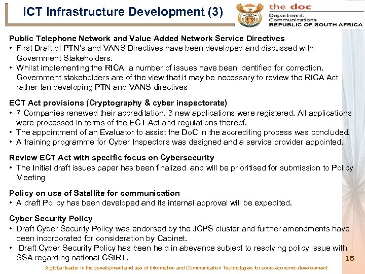 ICT Infrastructure Development (2) DTT infrastructure roll • Sentech has to upgrade existing DVB-T transmitters to DVB-T 2. They are currently in the tender/procurement process for DVB-T 2 equipment. • The monitoring of the roll-out of Low power Transmitters has been continuoulsy conducted including regular site visits. Set Top Boxes standards conformance testing • EMC and Safety requirements and local capabilities have been defined and discussions on requirements for software and functional testing still on-going. • Technical Sub - working group under chairmanship of Do. C has been formed to specifically address the conformance testing requirements of the STB’s. • Interaction with foreign conformance testing organizations initiated. • Tender for conformance-testing equipment is being finalised. Mobile, fixed line and internet directives (RICA) • RICA Directives amended to address shortcomings identified by law enforcement and ICT industry. The amendments were developed in conjunction with Government Stakeholders and Industry. The Minister of Communications is in the process of consulting relevant Ministers and ICASA 14 A global leader in the development and use of Information and Communication Technologies for socio-economic development