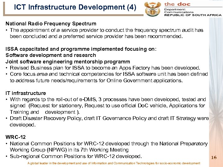 ICT Infrastructure Development (3) Public Telephone Network and Value Added Network Service Directives • First Draft of PTN’s and VANS Directives have been developed and discussed with Government Stakeholders. • Whilst implementing the RICA a number of issues have been identified for correction. Government stakeholders are of the view that it may be necessary to review the RICA Act rather tan developing PTN and VANS directives ECT Act provisions (Cryptography & cyber inspectorate) • 7 Companies renewed their accreditation, 3 new applications were registered. All applications were processed in terms of the ECT Act and regulations thereof. • The appointment of an Evaluator to assist the Do. C in the accrediting process was concluded. • A training programme for Cyber Inspectors was designed and a service provider appointed. Review ECT Act with specific focus on Cybersecurity • The Initial draft issues paper has been finalized and will be prioritised for submission to Policy Meeting Policy on use of Satellite for communication • A draft Policy has been developed and its internal approval will be expedited. Cyber Security Policy • Draft Cyber Security Policy was endorsed by the JCPS cluster and further amendments have been incorporated for consideration by Cabinet. • Draft Cyber Security Policy has been held in abeyance subject to resolving policy issue with SSA regarding national CSIRT. 15 A global leader in the development and use of Information and Communication Technologies for socio-economic development