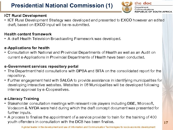 ICT Infrastructure Development (4) National Radio Frequency Spectrum • The appointment of a service provider to conduct the frequency spectrum audit has been concluded and a preferred service provider has been recommended. ISSA capacitated and programme implemented focusing on: Software development and research Joint software engineering mentorship programm • Revised Business plan for ISSA to become an Apps Factory has been developed. • Core focus area and technical competencies for ISSA software unit has been defined to address future needs/requirements for Online Government applications. IT infrastructure • With regards tp the roll-out of e-DMS, 3 processes have been developed, tested and signed (Request for stationery, Request to use official Do. C vehicle, Applications for Training and development ). • Draft Disaster Recovery Policy, draft IT Governance Policy and draft IT Strategy were developed. WRC-12 • National Common Positions for WRC-12 developed through the National Preparatory Working Group (NPWG) in its 7 th Working Meeting • Sub-regional Common Positions for WRC-12 developed. 16 A global leader in the development and use of Information and Communication Technologies for socio-economic development