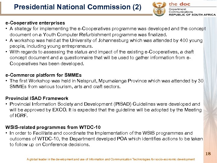 Presidential National Commission (1) ICT Rural Development • ICT Rural Development Strategy was developed and presented to EXCO however an edited draft, based on EXCO input will be re-submitted. Health content framework • A draft Health Television Broadcasting Framework was developed. e-Applications for health • Consultation with National and Provincial Departments of Health as well as an Audit on current e-Applications in Provincial Departments of Health have been conducted. e-Government services repository portal • The Department held consultations with DPSA and SITA on the consolidated report for the repository. • Further engagement held with SALGA to provide assistance in identifying municipalities for developing interactive websites. Websites in 08 Municipalities will be developed following internal approval by e-Cooperatives. e-Literacy Training • Stakeholder consultation meetings with relevant role players including DBE, Microsoft, Vodacom & NYDA were held during which the draft concept document was presented for further inputs. • A process to finalise the appointment of a service provider to train for the training of 400 youth offenders in consultation with the DCS has been finalise. 17 A global leader in the development and use of Information and Communication Technologies for socio-economic development