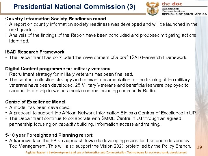 Presidential National Commission (2) e-Cooperative enterprises • A strategy for implementing the e-Cooperatives programme was developed and the concept document on a Youth Computer Refurbishment programme was finalized. • A workshop was held at the University of Johannesburg which was attended by 400 young people, including young entrepreneurs. • With regards to assessing the status and impact of the existing e-Cooperatives, a draft concept document and a questionnaire that will be used to gather information from e. Cooperatives has been developed. e-Commerce platform for SMMEs • The first Workshop was held in Nelspruit, Mpumalanga Province which was attended by 30 SMMEs from various tourism, arts and craft sectors. Provincial ISAD Framework • Provincial Information Society and Development (PISAD) Guidelines were developed and will be approved by EXCO. It is expected that the guideline will be adopted by the Meeting of IGRF. WSIS-related programmes from WTDC-10 • In order to Facilitate and coordinate the Implementation of the WSIS programmes and outcomes of WTDC-10, the Department develped POA which identifies actions to be taken to follow up on Conference decisions. 18 A global leader in the development and use of Information and Communication Technologies for socio-economic development