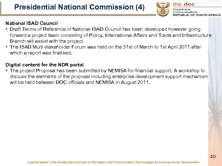 Presidential National Commission (4) National ISAD Council • Draft Terms of Reference of National ISAD Council has been developed however going forward a project team consisting of Policy, International Affairs and Trade and Infrastructure Branch will assist with the project. • The ISAD Multi-stakeholder Forum was held on the 31 st of March to 1 st April 2011 after which a report was finalised. Digital content for the NDR portal • The project Proposal has been submitted by NEMISA for financial support. A workshop to discuss the elements of the proposal including enterprise development support mechanism will be held between DOC officials and NEMISA in August 2011. 20 A global leader in the development and use of Information and Communication Technologies for socio-economic development