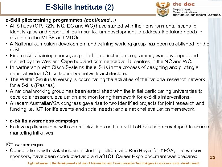 E-Skills Institute (1) Application (Apps) factories (Laboratories) • Mo. U with UNDP to assist the e-SI in developing a conceptual document and the implementation thereof has been complete. A conceptual document has also been completed and discussion is in the process with key stakeholder groups • Discussion is taking place with 3 Hubs i. e. EC, GP, and WC and stakeholder communities in incorporating the Apps factories as part of the hubs activities. SA’s creative industry • Environmental scans currently being done by the e-Skills hubs on e-skills for creative industry which also covers a needs analysis. The outcome of these scans will guide the process forward. • Going forward it has been decided that a cross functional project team consisting of PNC and Policy development will participate in the project so as to cover the aspects of content and broadcasting. e-Skill pilot training programmes • FOSS Training was arranged by Northern Cape hub and conducted in North West Province with participation from the Northern Cape. • Two Kiosks terminals were installed at Umsunduzi Municipality. • Competency based trained was conducted with Municipality technicians and marketing personnel by South Korean IT company. • The following FET Colleges have started with Multimedia course training: Ekurhuleni East, Orbit FET College, South West FET College and Capricorn FET College. 21 A global leader in the development and use of Information and Communication Technologies for socio-economic development