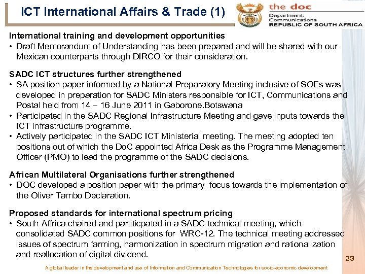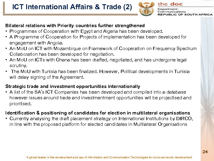 ICT International Affairs & Trade (1) International training and development opportunities • Draft Memorandum of Understanding has been prepared and will be shared with our Mexican counterparts through DIRCO for their consideration. SADC ICT structures further strengthened • SA position paper informed by a National Preparatory Meeting inclusive of SOEs was developed in preparation for SADC Ministers responsible for ICT, Communications and Postal held from 14 – 16 June 2011 in Gaborone. Botswana • Participated in the SADC Regional Infrastructure Meeting and gave inputs towards the ICT infrastructure programme. • Actively participated in the SADC ICT Ministerial meeting. The meeting adopted ten positions out of which the Do. C appointed Africa Desk as the Programme Management Officer (PMO) to lead the programme of the SADC decisions. African Multilateral Organisations further strengthened • DOC developed a position paper with the primary focus towards the implementation of the Oliver Tambo Declaration. Proposed standards for international spectrum pricing • South Affrica chaired and partiticpated in a SADC technical meeting, which consolidated SADC common positions for WRC-12. The technical meeting addressed issues of spectrum farming, harmonization in spectrum migration and rationalization and reallocation of digital dividend. 23 A global leader in the development and use of Information and Communication Technologies for socio-economic development