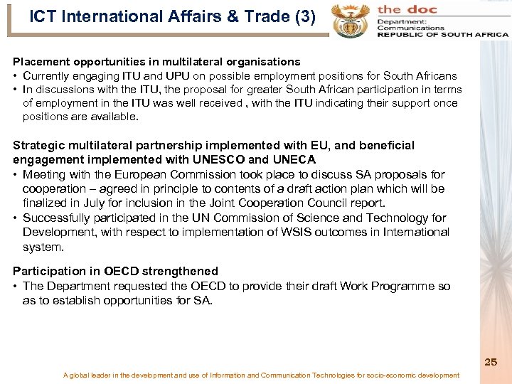 ICT International Affairs & Trade (2) Bilateral relations with Priority countries further strengthened • Programmes of Cooperation with Egypt and Algeria has been developed. • A Programme of Cooperation for Projects of implementation has been developed for engagement with Angola. • An Mo. U on ICT with Mozambique on Framework of Cooperation on Frequency Spectrum Collaboration has been developed for negotiation. • An Mo. U on ICTs with Ghana has been drafted, negotiated, and has undergone legal scrutiny. • The Mo. U with Tunisia has been finalized. However, Political developments in Tunisia will delay signing of the Agreement. Strategic trade and investment opportunities internationally • A list of the SA’s ICT Companies has been developed and compiled into a database however issues around trade and investment opportunities will be projectised and prioritised. Identification & positioning of candidates for election in multilateral organisations • Currently analysing the draft placement strategy on International Institutions by DIRCO, in line with the proposed platform for elected candidates in Multilateral Organisations 24 A global leader in the development and use of Information and Communication Technologies for socio-economic development
