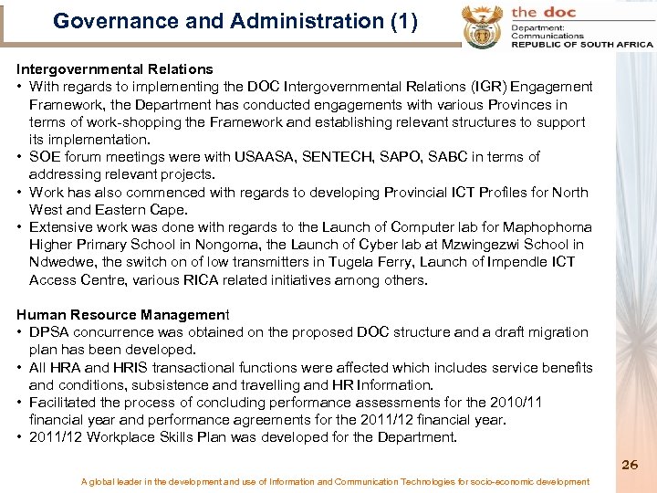 Governance and Administration (1) Intergovernmental Relations • With regards to implementing the DOC Intergovernmental Relations (IGR) Engagement Framework, the Department has conducted engagements with various Provinces in terms of work-shopping the Framework and establishing relevant structures to support its implementation. • SOE forum meetings were with USAASA, SENTECH, SAPO, SABC in terms of addressing relevant projects. • Work has also commenced with regards to developing Provincial ICT Profiles for North West and Eastern Cape. • Extensive work was done with regards to the Launch of Computer lab for Maphophoma Higher Primary School in Nongoma, the Launch of Cyber lab at Mzwingezwi School in Ndwedwe, the switch on of low transmitters in Tugela Ferry, Launch of Impendle ICT Access Centre, various RICA related initiatives among others. Human Resource Management • DPSA concurrence was obtained on the proposed DOC structure and a draft migration plan has been developed. • All HRA and HRIS transactional functions were affected which includes service benefits and conditions, subsistence and travelling and HR Information. • Facilitated the process of concluding performance assessments for the 2010/11 financial year and performance agreements for the 2011/12 financial year. • 2011/12 Workplace Skills Plan was developed for the Department. 26 A global leader in the development and use of Information and Communication Technologies for socio-economic development
