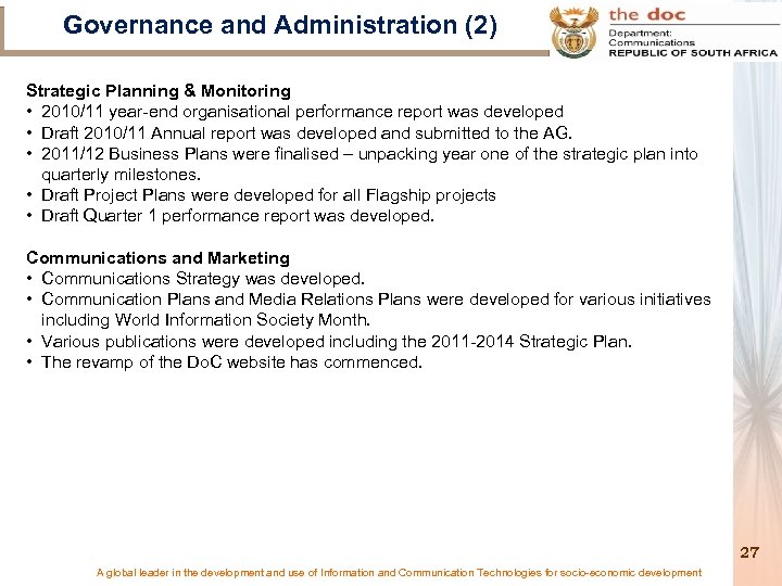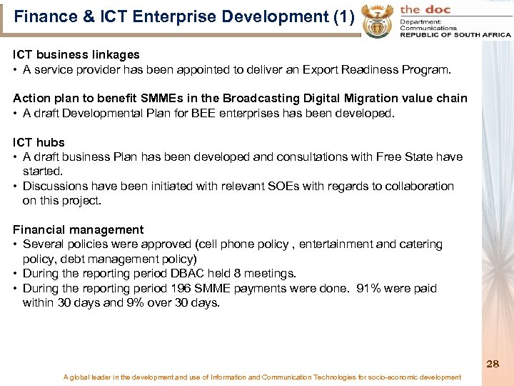 Governance and Administration (2) Strategic Planning & Monitoring • 2010/11 year-end organisational performance report was developed • Draft 2010/11 Annual report was developed and submitted to the AG. • 2011/12 Business Plans were finalised – unpacking year one of the strategic plan into quarterly milestones. • Draft Project Plans were developed for all Flagship projects • Draft Quarter 1 performance report was developed. Communications and Marketing • Communications Strategy was developed. • Communication Plans and Media Relations Plans were developed for various initiatives including World Information Society Month. • Various publications were developed including the 2011 -2014 Strategic Plan. • The revamp of the Do. C website has commenced. 27 A global leader in the development and use of Information and Communication Technologies for socio-economic development