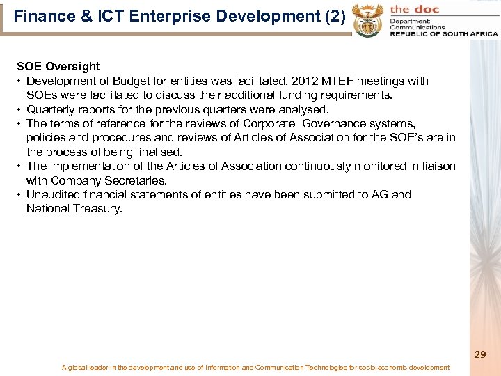 Finance & ICT Enterprise Development (1) ICT business linkages • A service provider has been appointed to deliver an Export Readiness Program. Action plan to benefit SMMEs in the Broadcasting Digital Migration value chain • A draft Developmental Plan for BEE enterprises has been developed. ICT hubs • A draft business Plan has been developed and consultations with Free State have started. • Discussions have been initiated with relevant SOEs with regards to collaboration on this project. Financial management • Several policies were approved (cell phone policy , entertainment and catering policy, debt management policy) • During the reporting period DBAC held 8 meetings. • During the reporting period 196 SMME payments were done. 91% were paid within 30 days and 9% over 30 days. 28 A global leader in the development and use of Information and Communication Technologies for socio-economic development